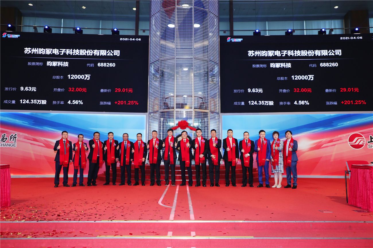 4月6日上午,苏州昀冢电子科技股份有限公司(简称昀冢科技,股票代码为688260)在上海证券交易所科创板挂牌上市,一开盘,昀冢科技便收获开盘长红,股价迅速升至32.00元,涨幅超220%。这是昆山今年第二家上市企业,也是周市镇首家登陆科创板的企业。至此,资本市场“昆山板块”扩容至126家企业。市委副书记徐华东,副市长曹晔,苏州昀冢电子科技股份有限公司董事长、总经理王宾,上海证券交易所副总经理董国群等共同敲响开市铜锣。