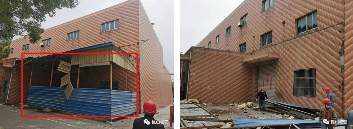 庆丰路某体育用品公司内部存在多处违法建设,部分违法建设主要用于仓储物品,复工复产后,每天都有企业人员及货物进出,构筑物本身不仅高度较高(高约4米),而且钢结构三角梁及主梁已经出现锈蚀,存在坍塌隐患。为此,昆山开发区综合行政执法局长江中队第一时间上门,从安全生产的角度向企业负责人阐述拆除违法建设的必要性,并且联系专业的拆除作业人员,帮助企业拆除违法建设。日前,在做好人员疫情防护、拆违安全的情况下,该企业完成内部违建拆除工作,拆违面积200平方米。