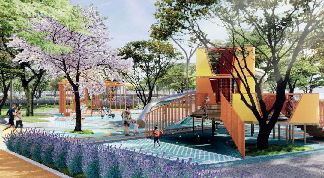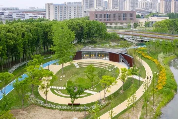 创新性地打造了服务科创园区及城市社区的开放空间,西侧以“科创与教育”为主题打造露天森林剧场、生态林地探索绿道等节点,东侧以社区休闲为主题,引入方便各年龄层市民的活动空间,激发廊道活力。