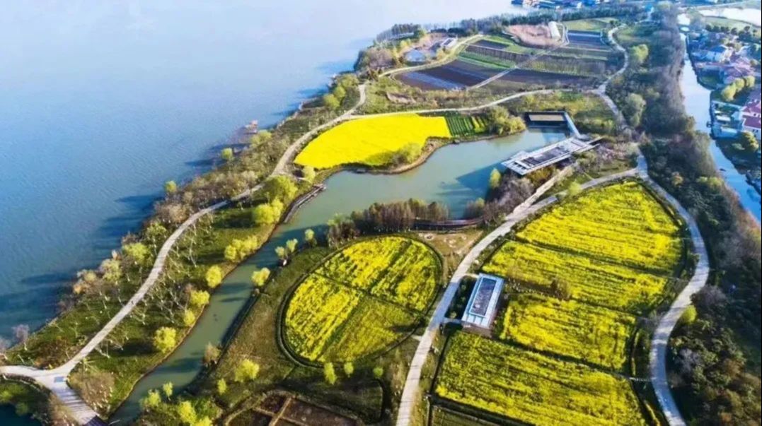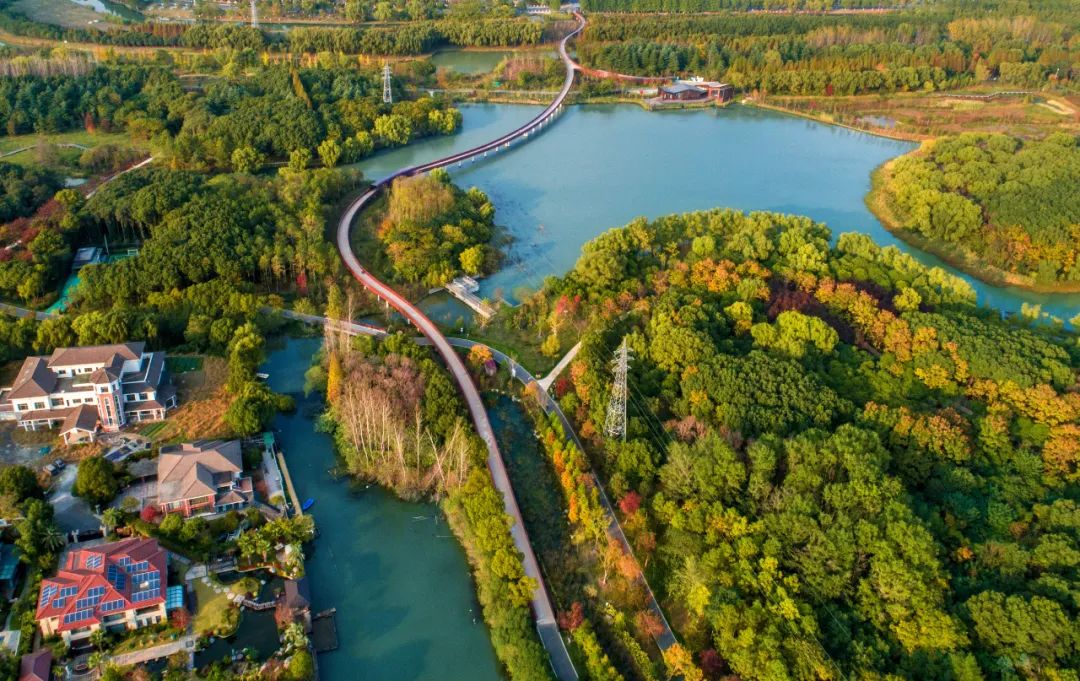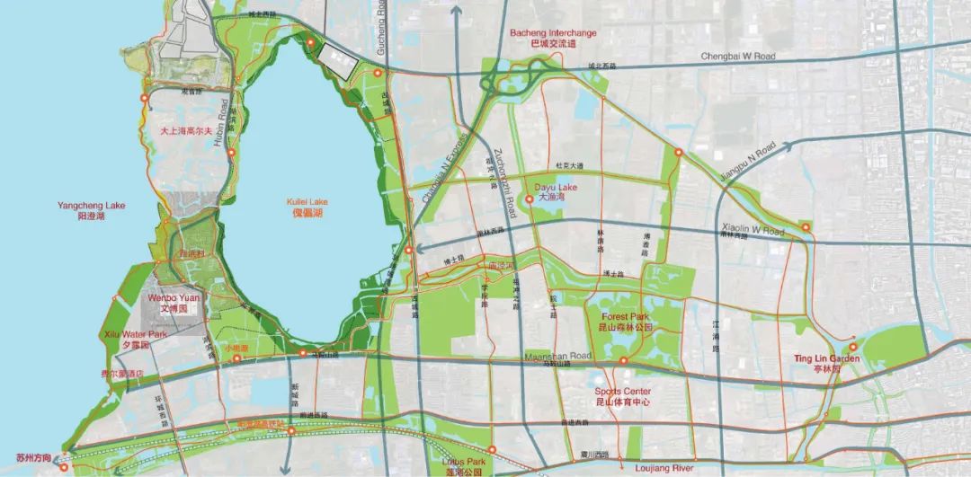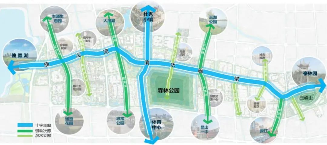 通过适度整合区域性慢行交通路网系统,串联起阳澄湖公园、夕露园、悦丰岛等生态景观和智谷小镇等科创园区,昆曲学社、绰墩稻作遗址、小桃源等文旅项目,贯通森林公园、亭林园等公共空间,构建阳澄湖、傀儡湖、大渔湖、亭林园、森林公园和庙泾河中央水廊的完整生态系统,打造充满诗意、功能复合的绿色生态走廊。