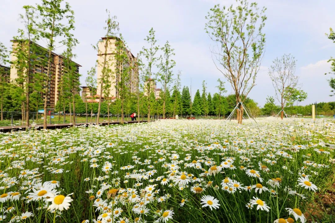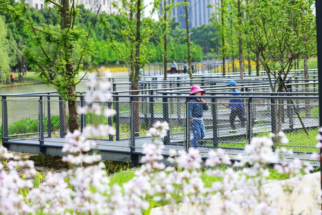 通过林地恢复、河岸改造,保护并提升生物多样性,让5月的庙泾河中央水廊犹如生机盎然的“植物王国”,生态景观品质全面提升。