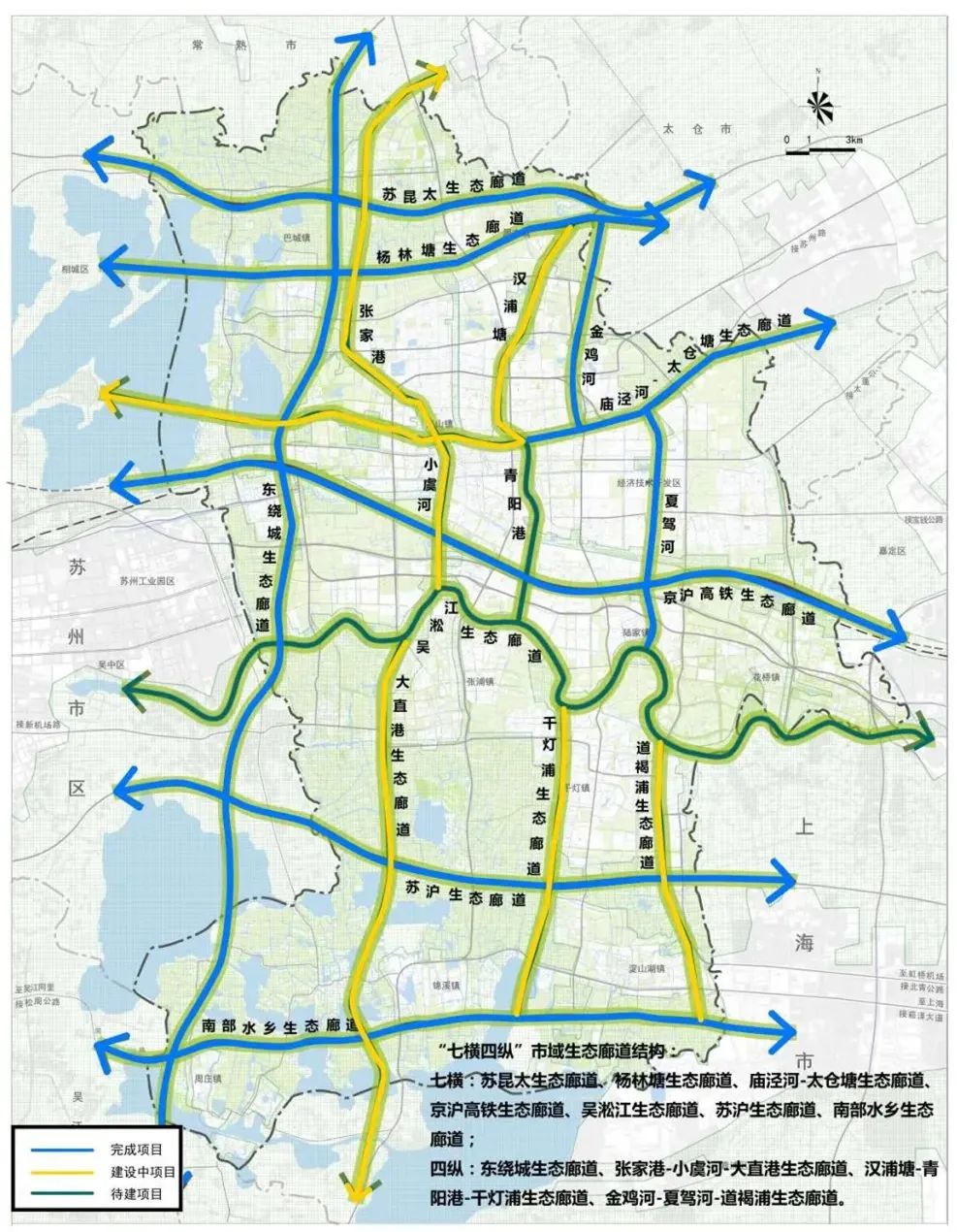 截至目前,我市已经完成杨林塘、太仓塘、吴淞江先导段、京沪高铁、夏驾河等多条生态廊道建设,总里程达到170公里。