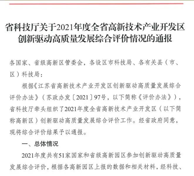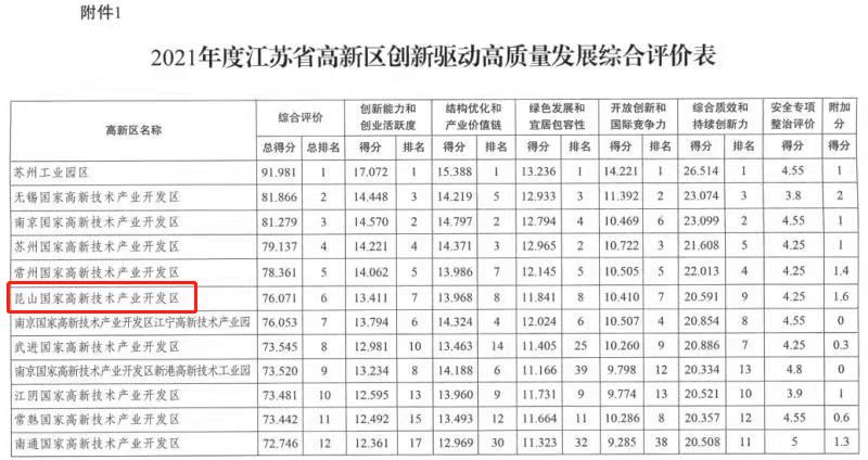 近日,江苏省科技厅发布《省科技厅关于2021年度全省高新技术产业开发区创新驱动高质量发展综合评价情况的通报》,公布全省51家国家和省级高新区创新驱动发展综合评价排名,昆山国家高新技术产业开发区位列第六,继续保持全省县域第一。
