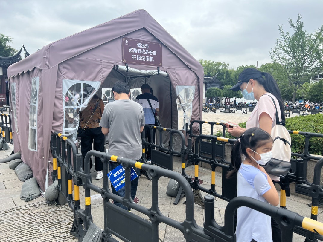 上午九点半,记者在亭林园出入口看到,每一位入园的游客都佩戴好口罩,并在工作人员的引导下,扫码、测体温、依次进入景区,现场秩序良好。工作人员还不时提醒大家保持安全距离、有序入园。园内,市民或带着家人孩子、或约上三五好友,散步、登山,休闲放松,享受假日时光。