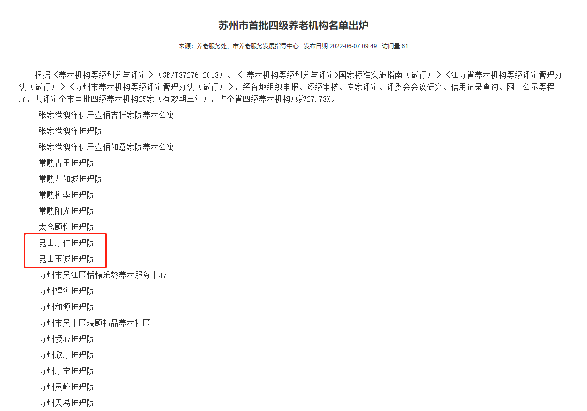 昆山康仁护理院始建于2012年10月,是一家集医疗、护理、康复、临终关怀为一体的非营利性医疗护理机构,走出了一条将医疗管理和护理服务有机结合的康仁模式。目前院内有规划床位290张,其中医疗护理床位142张。“护理院现入住老人191名,根据老人的自理能力,分四个等级(介助、介护、特需、临终关怀)为老人提供完善的养老服务。”昆山康仁护理院负责人表示,在患者的康复治疗中,康仁采用心理疏导和身体康复相结合的模式,走出了一条将医疗管理和护理服务有机结合的康仁模式。