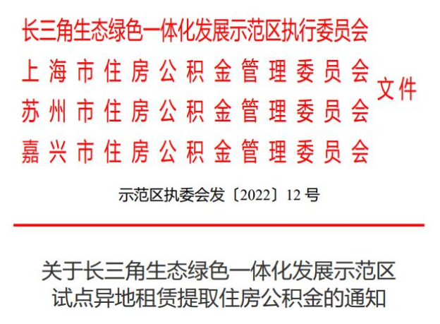 为了进一步提升区域一体化发展服务水平,服务长三角区域内人才流动、产业发展,支持职工租房需求,长三角生态绿色一体化发展示范区执行委员会、上海市住房公积金管理委员会、苏州市住房公积金管理委员会、嘉兴市住房公积金管理委员会联合印发《关于长三角生态绿色一体化发展示范区试点异地租赁提取住房公积金的通知》,创新试点在长三角示范区内支持职工提取住房公积金支付异地房屋租赁费用。