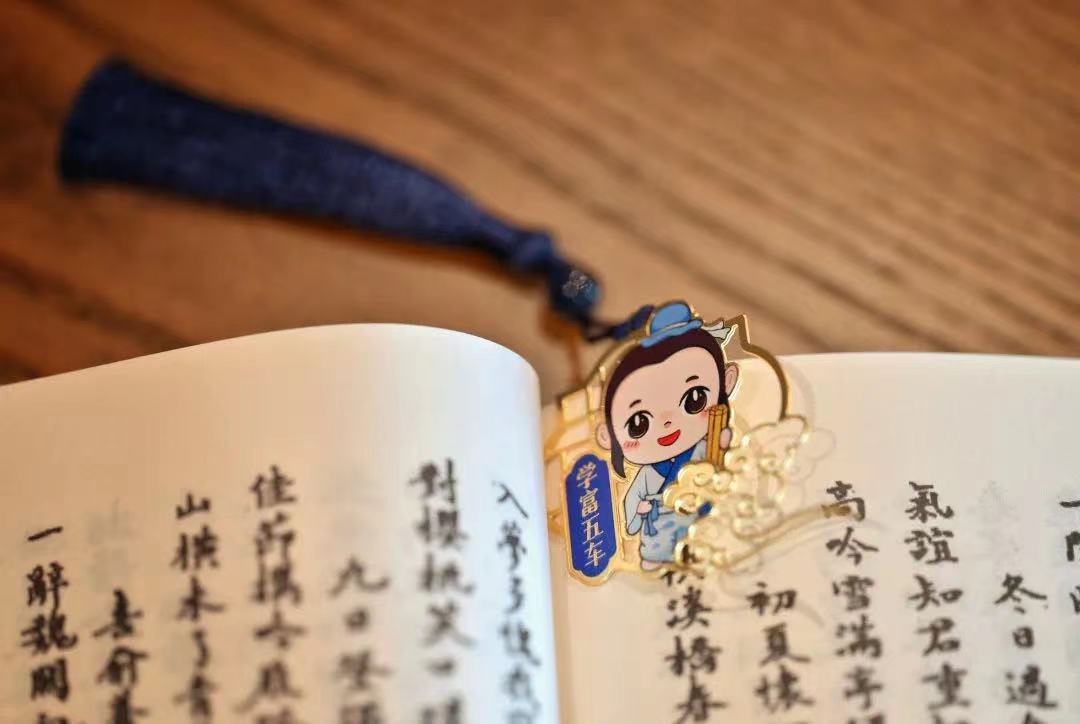 该文创产品礼盒包括六个书签和一把直尺,由金属制作而成,包含了小锦、小溪人物形象IP,锦溪古莲桥,文昌阁,祝甸砖窑文化馆,海棠糕,鲃鱼等锦溪地标性建筑和传统特色美食元素,并以祥云衬托,配有不同颜色的流苏,希望文运昌盛的锦溪能够为广大的考生添点好运气。书卷气的小锦书签寓意学富五车,灵动的小溪书签寓意风荷正举,带有文昌阁元素的书签寓意金榜题名,包含祝甸砖窑文化馆元素的书签取“窑”字谐音,寓意扶摇直上,包含海棠糕元素的书签寓意才高八斗,包含鲃鱼元素的书签寓意鱼跃龙门,而包含古莲桥元素的则是一把直尺,寓意步步生莲。