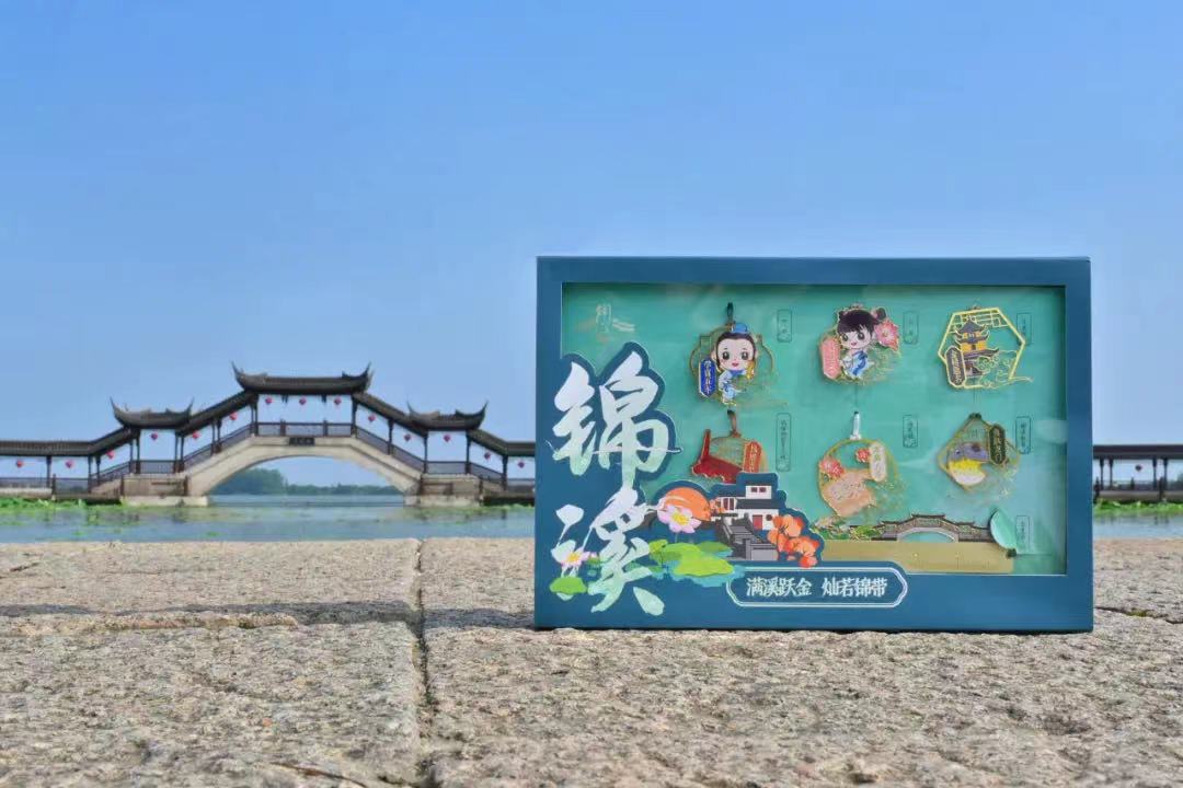 锦溪镇依托深厚的文化底蕴,借文创发力,让丰富的文化资源变“现”,先后推出了锦溪古莲桥网红冰淇淋、以锦溪金砖为原型的笔记本、将锦溪美景“一网打尽”的书签礼盒等文创产品,同时,还推出了小锦与小溪等卡通形象,让文创产品真正成为“带得走的文化”。