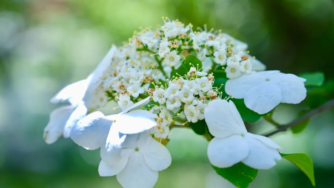 琼花是我国独有的古老珍稀花卉品种,亭林园经过多年陆续培植,已形成了园内两个琼花园、五百余棵琼花树的格局。琼花,外形由八朵白色雄性小花组合而成,因而又称“聚八仙”。花呈扁平,形似花环,而每朵小花又由五朵花瓣组成。其花后结实,绿如翡翠,待秋后籽熟,又转为赤红,犹如粒粒红宝石,悬于树梢。古代诗人盛赞其为“天下无双独此花”。