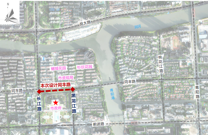 同丰路(长江路-黑龙江路)养护改善工程西起长江路道路边缘,向东交樾城路(本次同期设计)至黑龙江路(现状),全长331米;樾城路南起于同丰路道路中心线,北至现状已建樾城路,全长115米。项目采用双向四车道城市次干路标准,设计车速40km/h。