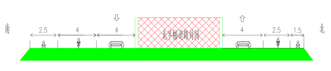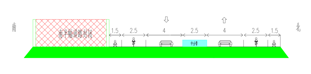 南半幅施工期间,北半幅车道由西向东单向通行,保通道路由东向西通行。