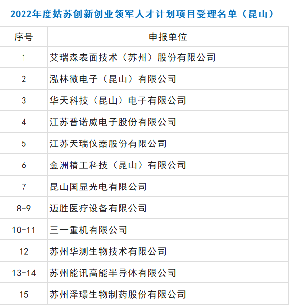 昆山15项!2022年度姑苏创新创业领军人才计划项目受理名单公示