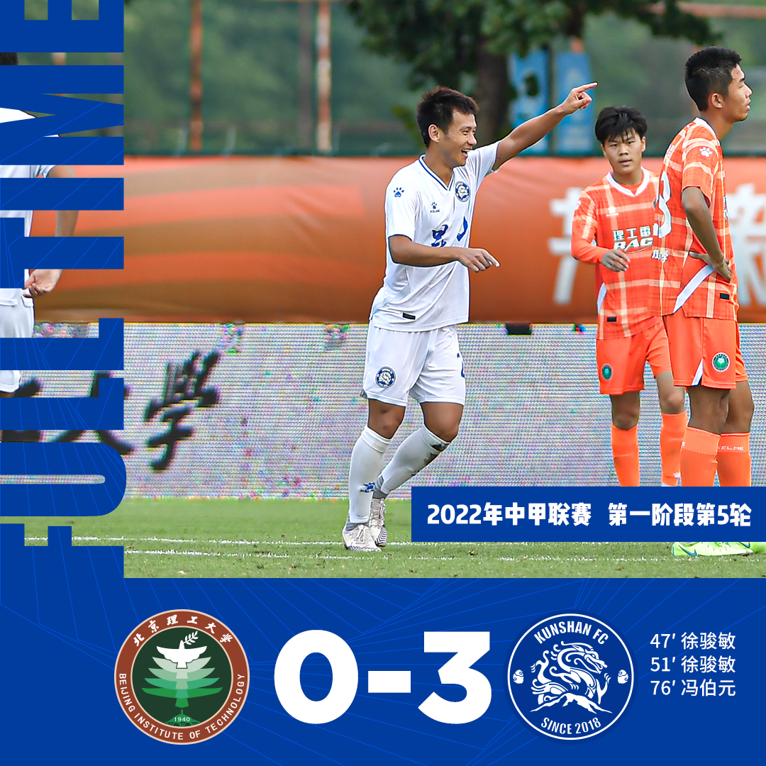 2022赛季中甲第5轮,昆山队对阵北京理工。昆山队本场对阵容做出部分轮换。球队上半场未能打破僵局,经过中场调整后,徐骏敏第47分钟直接任意球破门,他随后头球建功梅开二度,冯伯元补射再下一城。最终,昆山队3-0击败北京理工,收获联赛3连胜!