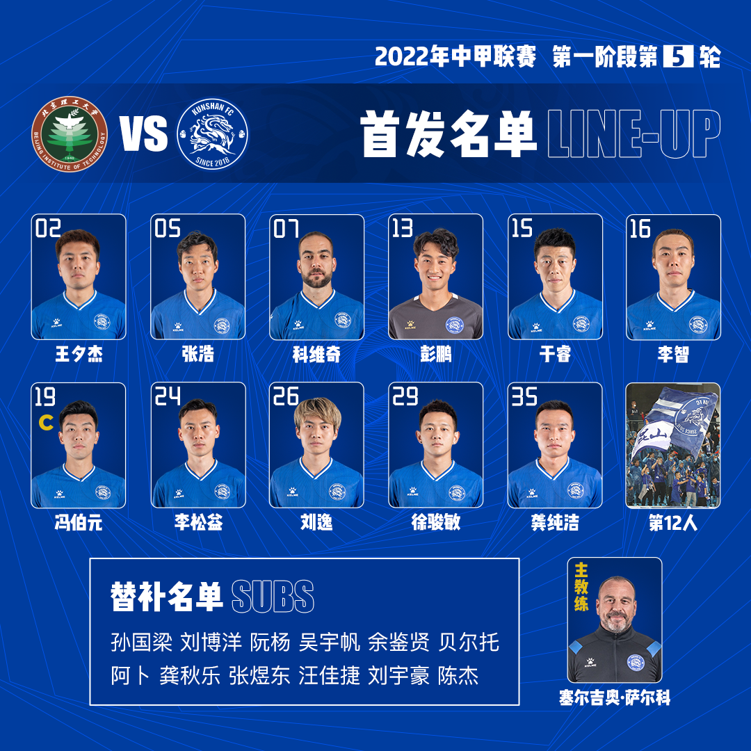 昆山队:2-王夕杰、5-张浩、7-科维奇(F)(46' 14-贝尔托(F))、13-彭鹏(GK U23)、15-于睿、16-李智(46' 10-阮杨)、19-冯伯元(C)、24-李松益、26-刘逸(60' 20-张煜东)、29-徐骏敏(77' 18-龚秋乐(U23))、35-龚纯洁(46' 17-阿卜(U23))