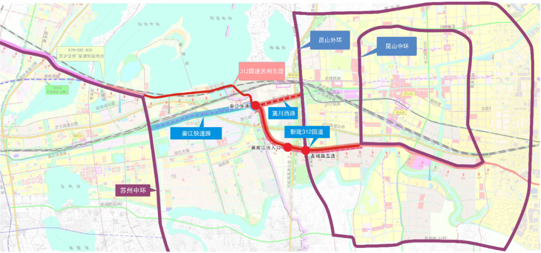后续将结合古城路快速化改造工程,在震川西路与古城路节点设置互通,进一步加强苏州中环与昆山外环的快速联系和转换。