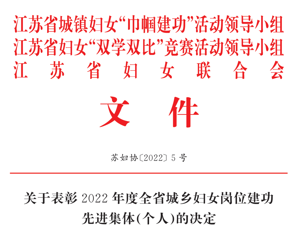近日,省妇联、省巾帼建功和双学双比活动领导小组联合发布了《关于表彰2022年度全省城乡妇女岗位建功先进集体(个人)的决定》。昆山市人力资源管理服务中心荣获“2022年度江苏省巾帼建功先进集体”称号。