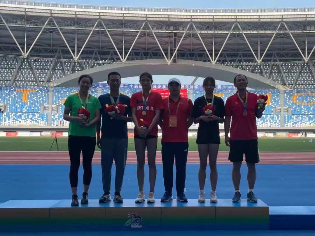 ▲昆山小将李文静(市二中体育班)获得女子17-18组100米亚军、女子17-18岁组200米季军,教练陆斌。