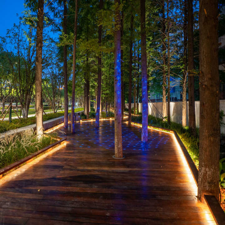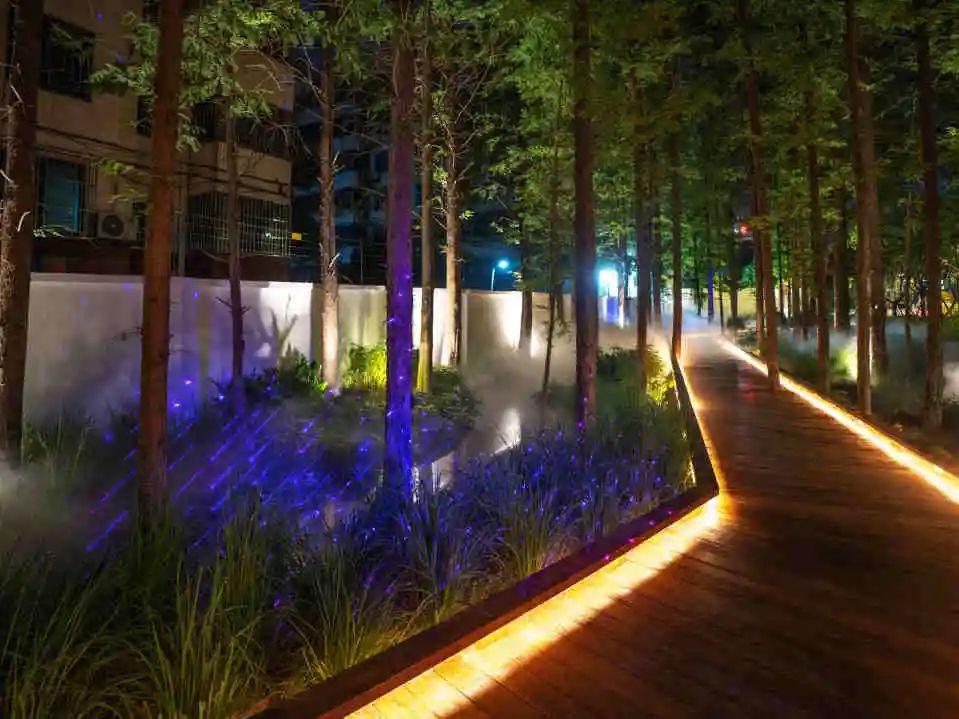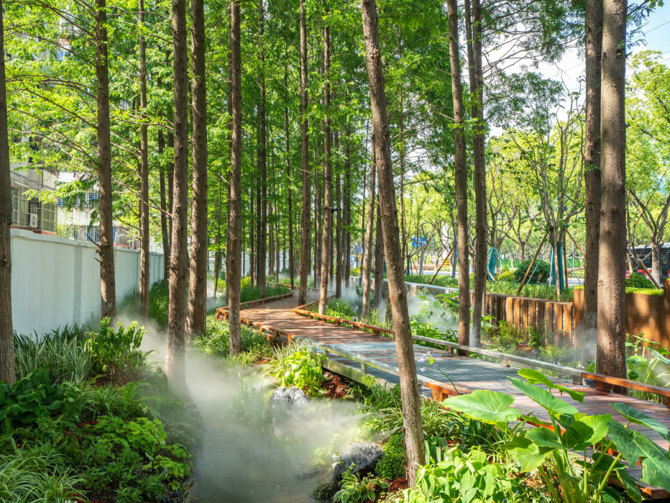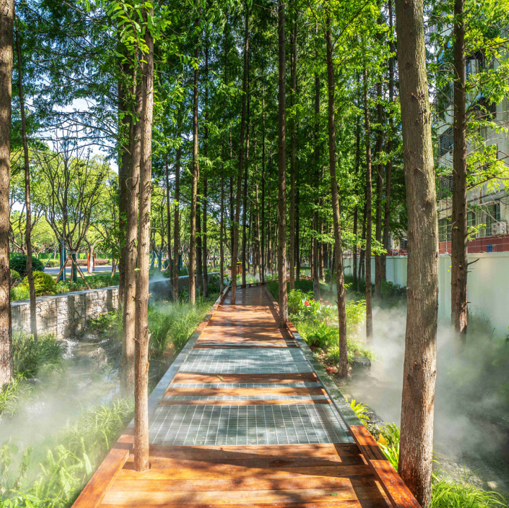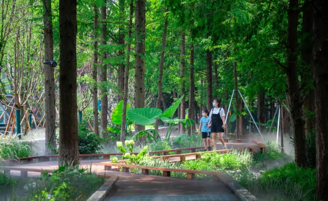 这里真的太美了,夏天走在这里,有树荫又有雾气,不会很热,宛如仙境一般,晚上还有五彩灯光,我们住在周边的居民能有这样一个休闲的地方,幸福感直接拉满。