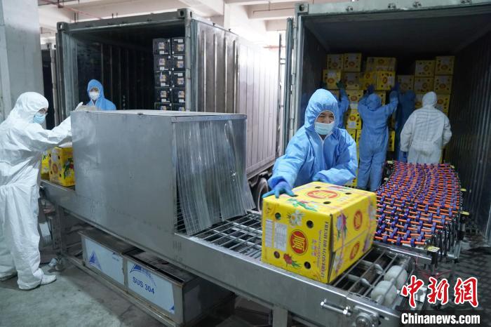▲资料图:广西凭祥市中国—东盟(凭祥)水果城内,工作人员将水果送入消毒机消毒。 陈冠言 摄