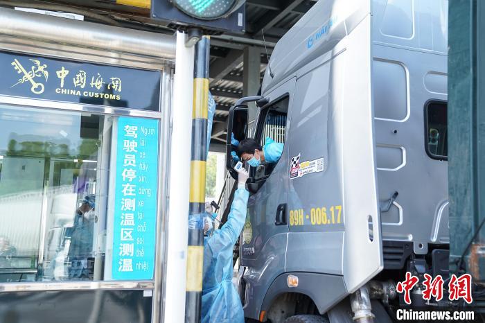 ▲资料图:在广西靖西市龙邦口岸,海关人员为一越南司机测体温。 陈冠言 摄