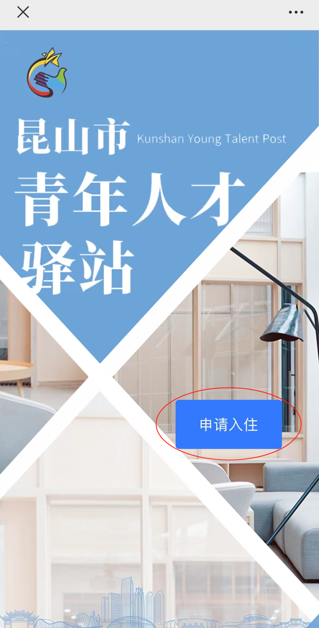 1. 关注“昆山团市委”微信公众号,在“服务”菜单栏中点击“青同行”-“青年人才驿站”,即可进入申请页面进行报名。