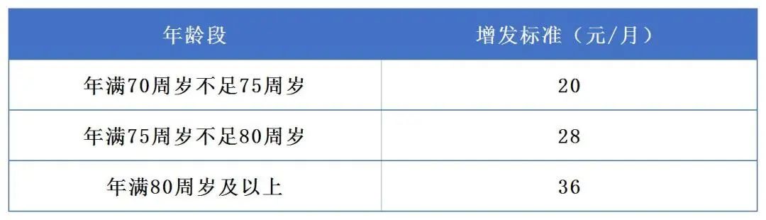 高龄倾斜:2021年12月31日年满70周岁(年龄以办理退休手续时确定的出生年月为准)、75周岁、80周岁的人员,在上述普发的基础上,每人每月分别增发20元、28元和36元。