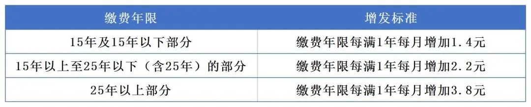注:按缴费年限月增加额不足21元的,按21元增加。