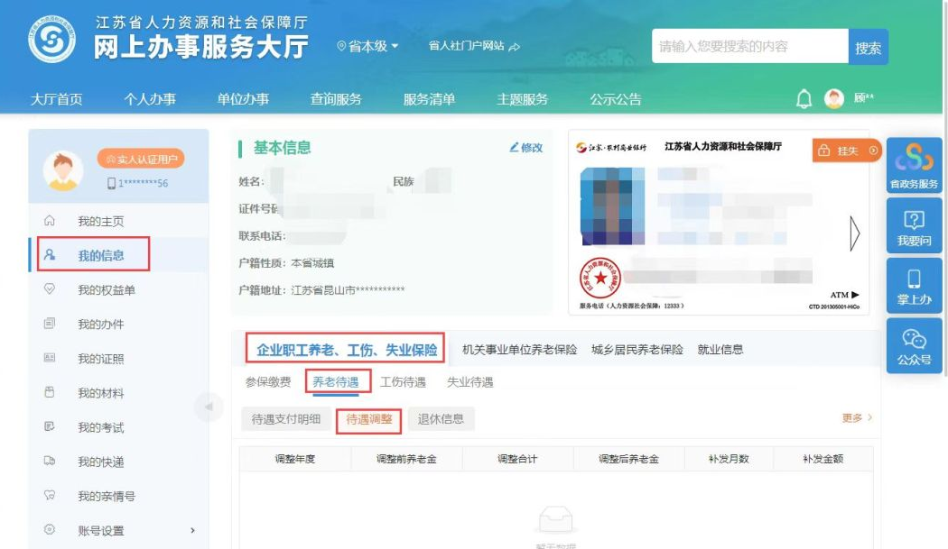 3.通过江苏人社网上办事服务大厅https://rs.jshrss.jiangsu.gov.cn/index/查询,个人用户登录后,点击“我的信息—企业职工养老、工伤、失业保险—养老待遇—待遇调整”进行查询。