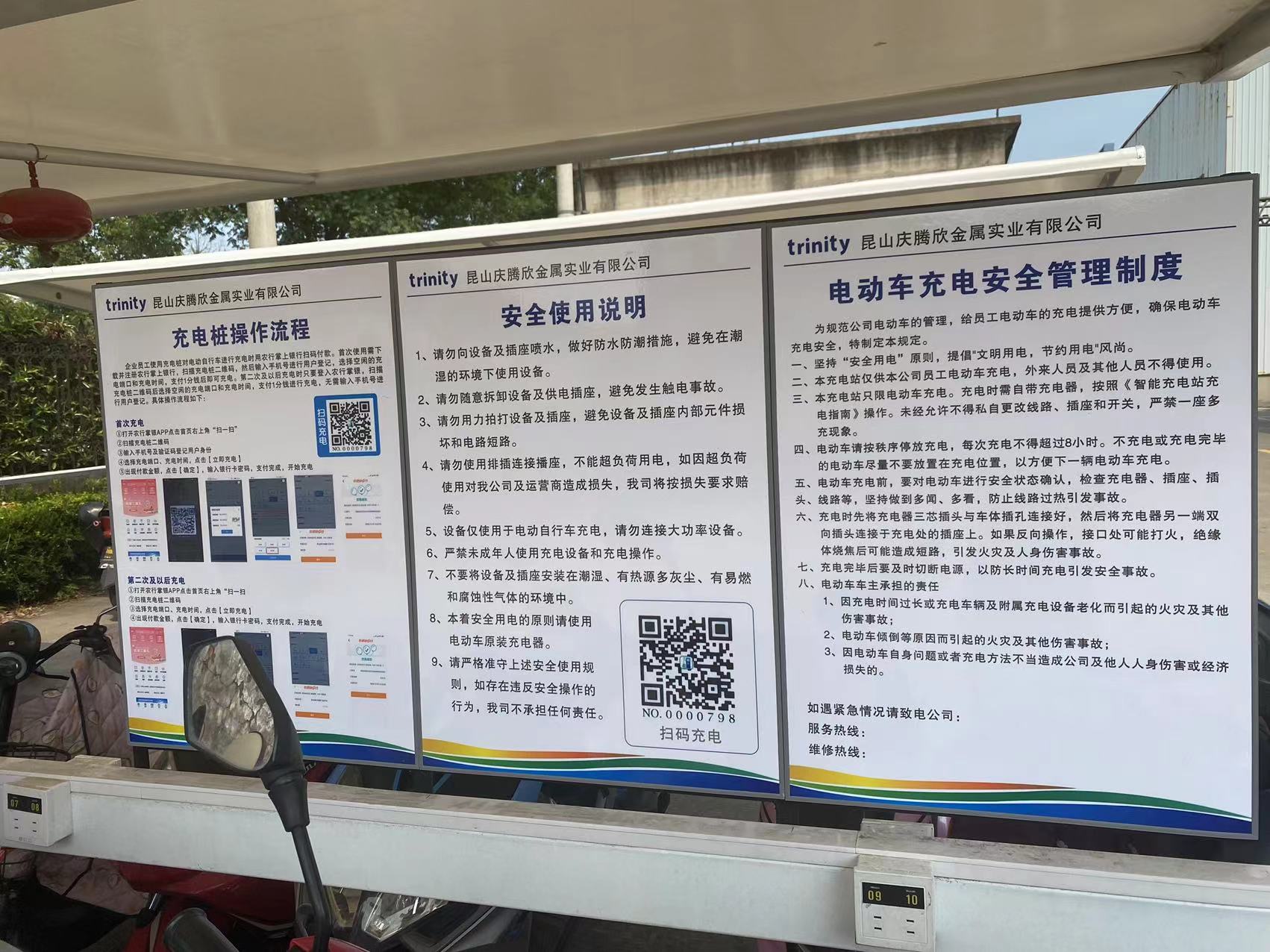 记者注意到,庆腾欣金属实业有限公司的集中充电棚内共有60个充电端口,可满足企业员工需求。充电棚内外还设置了24小时监控、烟感报警器、6个悬挂式干粉灭火装置及手持干粉灭火器,并且就近设有消防栓,安全系数较高。