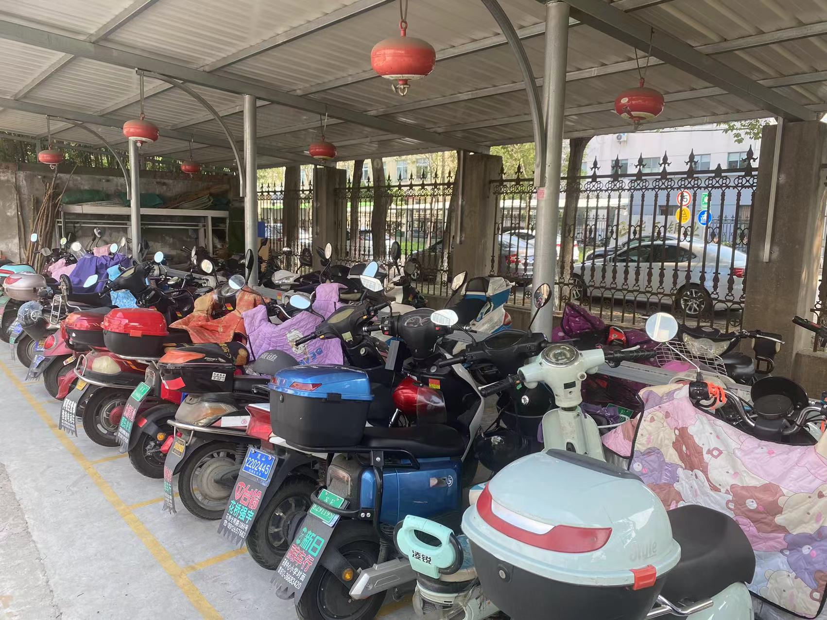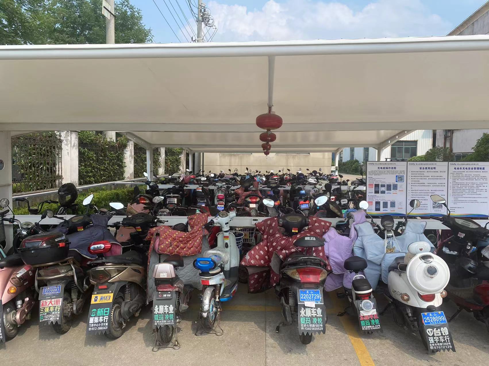 近日,记者在花桥经济开发区庆腾欣金属实业有限公司看到,一辆辆职工电动自行车整齐排放在非机动车棚内。车棚通体采用充电钢架和覆盖式钢结构雨棚,安装了带有断电保护装置的智能充电桩,并在车棚顶部安装了悬挂式干粉灭火器,一旦温度过高,会自动喷洒,及时灭火。