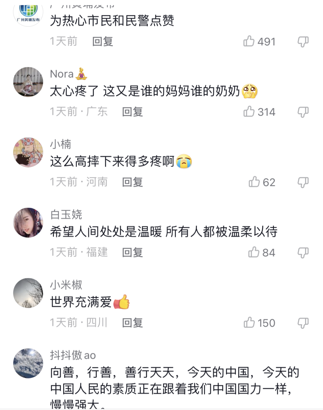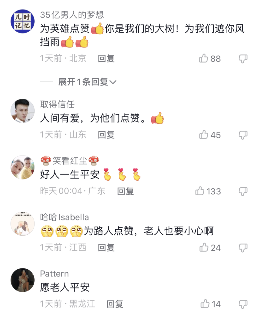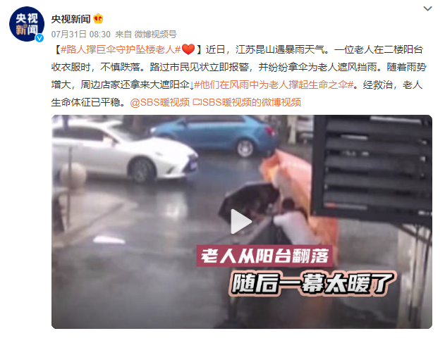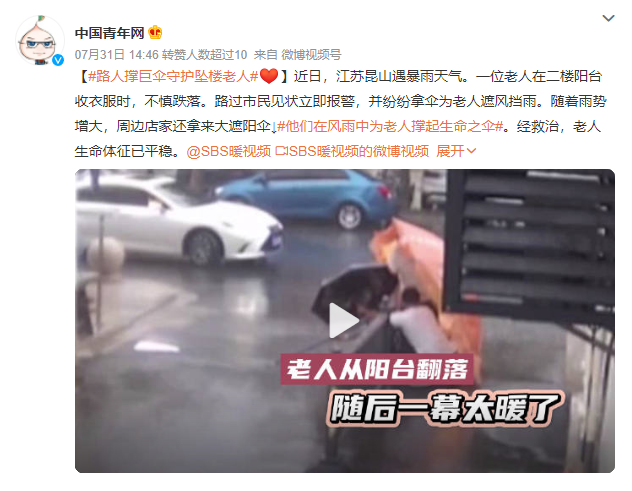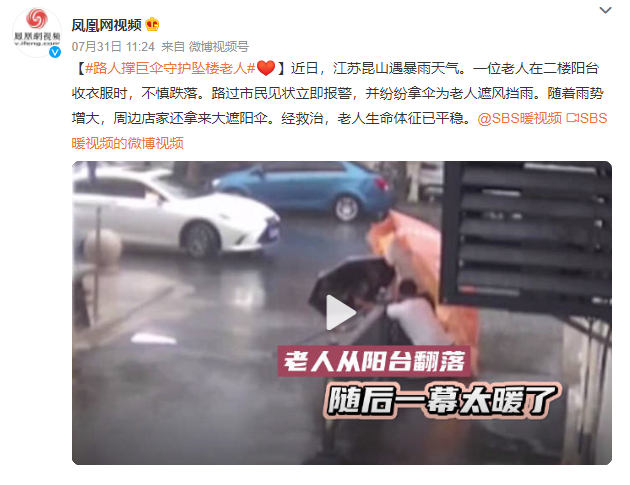 当时看到一位老太太躺在地上,不能移动,而且雨又下得很大,所以就赶紧跑过去在老人身旁撑起伞来,帮她遮挡一些风雨。我觉得遇到这种情况,每个人都应该伸出援助之手。