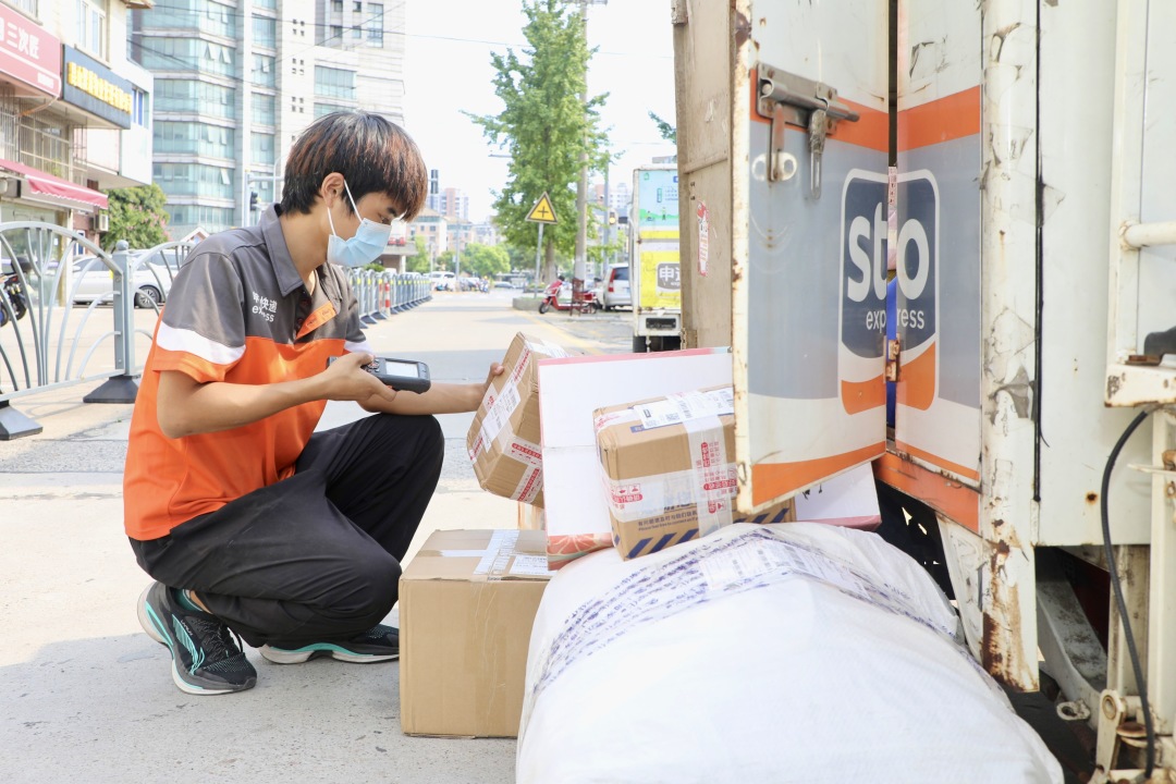 ▲快递员吴纯杰穿梭在大街小巷,为市民送去快递包裹