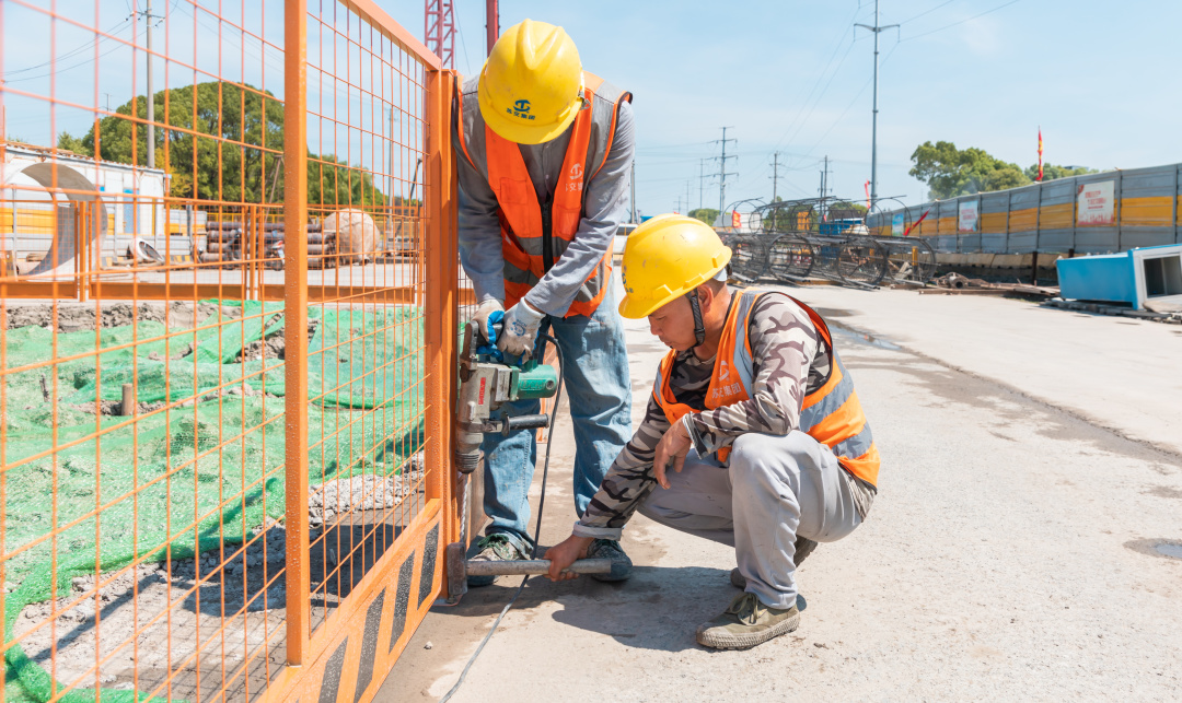 ▲在黄浦江路南段改扩建工程3标施工现场,工人顶着烈日施工