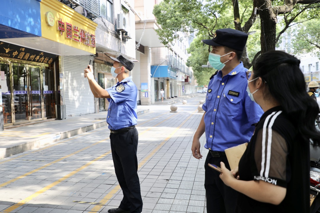 ▲开发区综合行政执法局长江中队队员柴孙杰、张一沿街巡查
