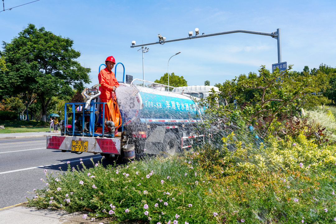▲市园林养护工作人员张阿小对马鞍山路、共青路沿路绿化带浇水养护