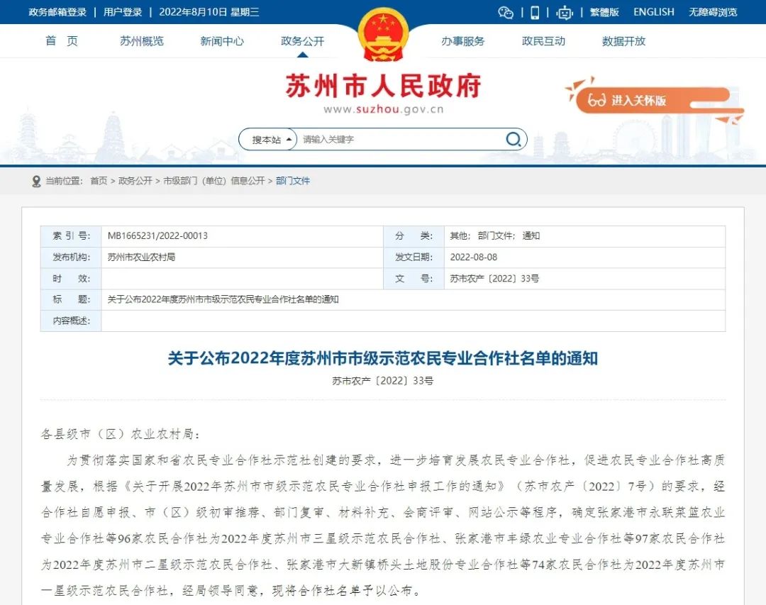 近日,苏州市农业农村局公布了新一批市级示范农民专业合作社名单,我市推荐的69家合作社全部上榜,数量位居苏州第一!
