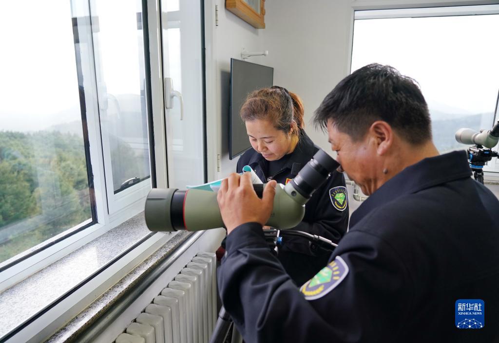 刘军(前)、王娟夫妇在塞罕坝机械林场月亮山望海楼内瞭望林场(2021年8月23日摄)。新华社记者 牟宇 摄