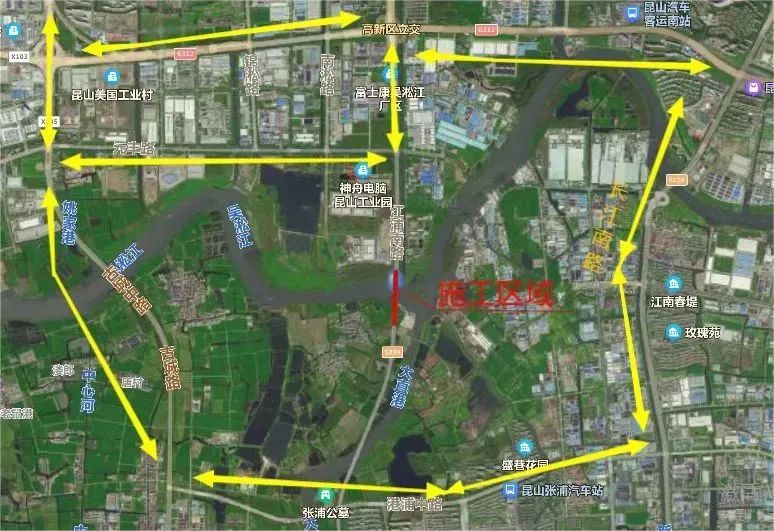 过往车辆可以参照下图路线进行绕行,或根据施工现场封闭情况按指定车道通行。
