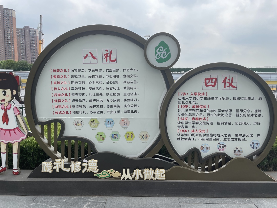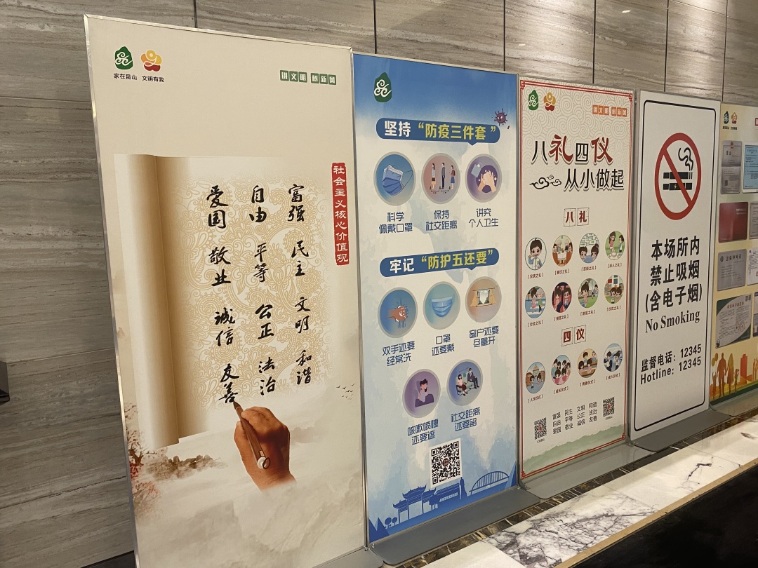 除了商业区,昆山还推动文明宣传进驻群众生活区。如今,各社区办事窗口、大小市场、楼盘小区、学校、工业区,处处都可以看到核心价值观的宣传海报、墙画、灯柱旗、LED显示屏,就连小区的电梯也成为了“文明窗口”。