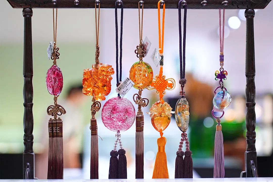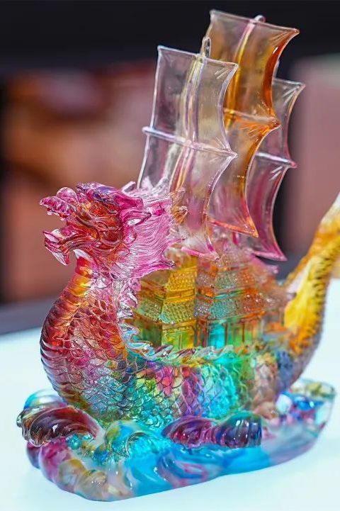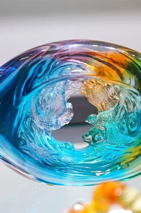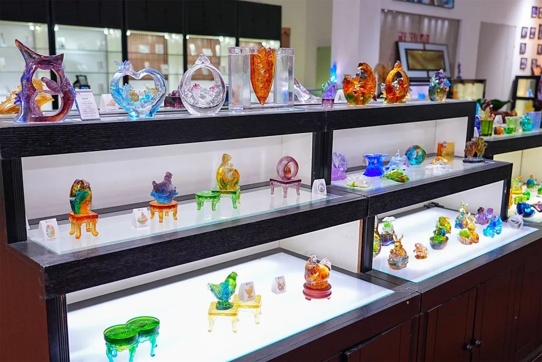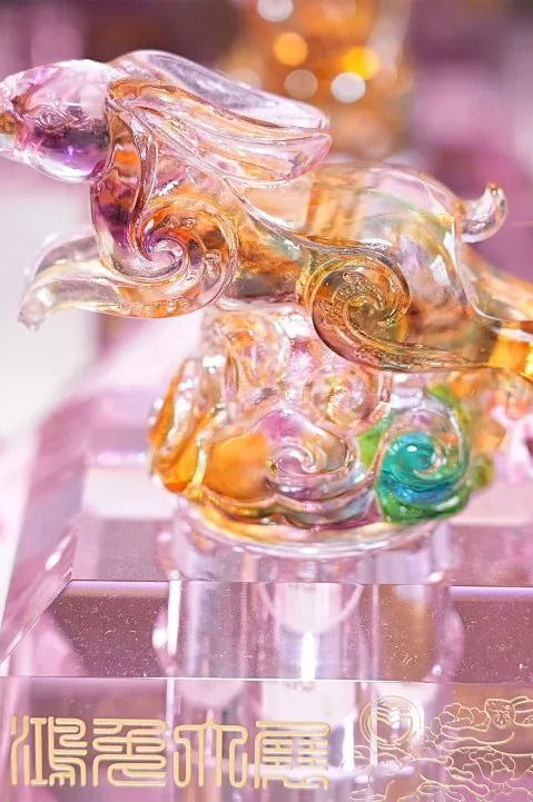 拾级而上,二楼展厅摆放的是一件件五彩斑斓、通透光润的琉璃工艺品。金鱼、百合、莲蓬、生肖等造型栩栩如生,令人目不暇接。“这里展出的大都出自艺术家之手,每件作品独具匠心。”尹灵说,当前,琉璃涉及的用途越来越广,不仅可以作为各种艺术装饰品,还成为艺术家们展示创作灵感的载体,许多大师级作品还被拍卖收藏。近年来,室内外装饰装潢也多采用琉璃装饰品进行点缀,更显高端大气。