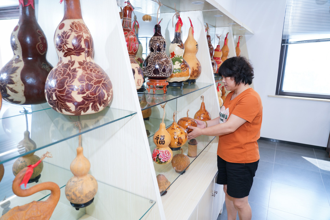 “连年有余”“龙凤呈祥”“花开富贵”……走进六如印象葫芦雕刻室,烙画匠人王美华正在雕刻葫芦。一个个雕刻完成的葫芦摇身一变成了文玩葫芦,吸引了不少游客参观、购买。村民王美华在工艺培训班学习烙画葫芦后,烙烫的葫芦作品精美剔透、灵动有致,标价也从数百元升至数千元。王美华还曾带着这些烙画葫芦走进浦东机场,惊艳中外旅客。