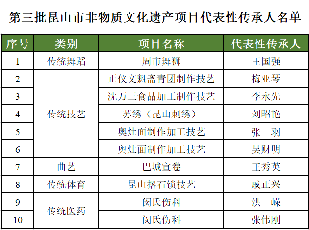 他们从事的项目涵盖传统舞蹈、传统技艺、曲艺、传统体育和传统医药五大类别。至此,我市各级非遗代表性传承人增至47名,其中省级传承人7名、苏州市级传承人10名、昆山市级传承人30名。