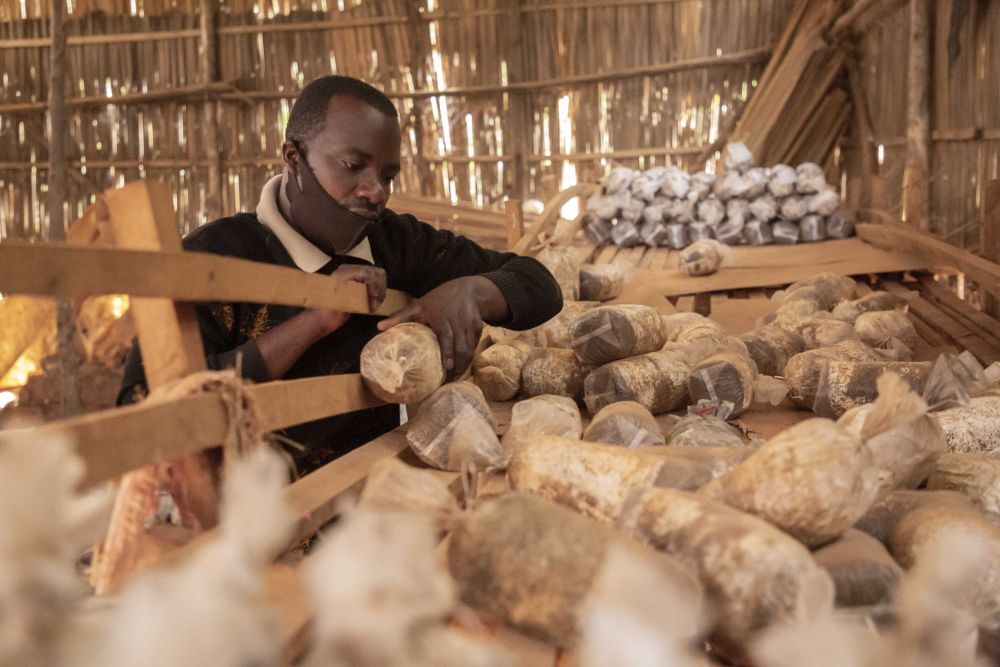 ▲在卢旺达首都基加利的一家食用菌培育作坊,作坊主人埃马纽埃尔·阿希马纳检查菌袋(2020年9月9日摄)。中国福建农林大学的菌草专家2006年来到卢旺达开始菌草技术合作项目,在当地示范和推广菌草技术。新华社发(西里尔·恩德格亚摄)