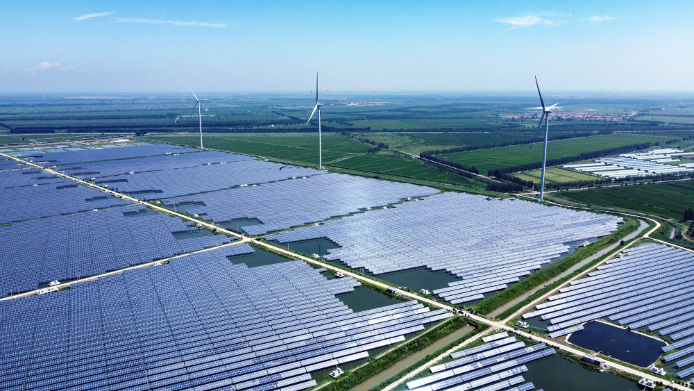 ▲这是在天津市宁河区宁河镇大月河村拍摄的110千伏大月河光伏电站(2022年7月18日摄,无人机照片)。新华社记者 孙凡越 摄