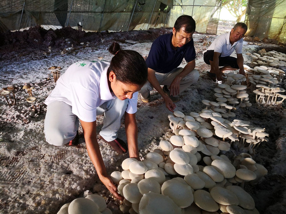 ▲在斐济楠迪,中国专家和当地雇员检查菌菇生长情况(2018年6月12日摄)。新华社记者 张永兴 摄