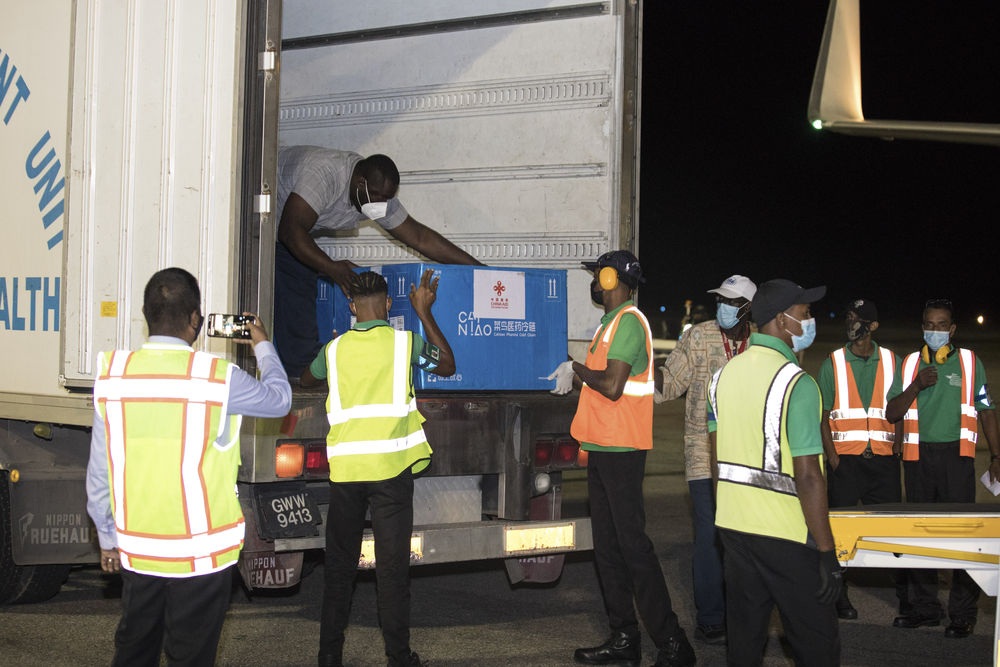 ▲工作人员在圭亚那首都乔治敦国际机场搬运中国援助的新冠疫苗(2021年3月2日摄)。新华社发(圭亚那新闻署供图)