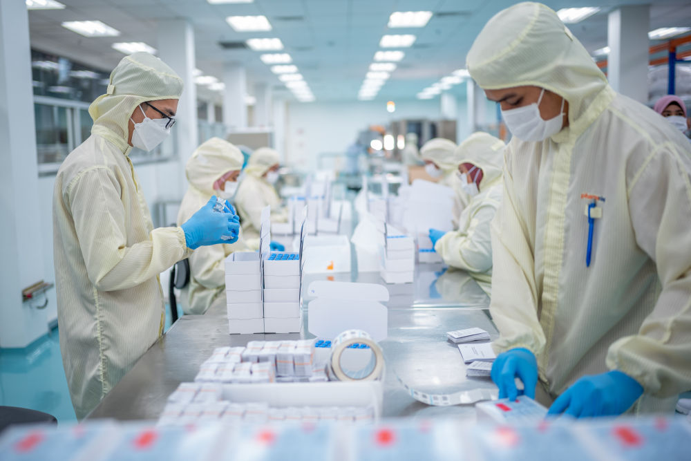 ▲工人在马来西亚吉隆坡郊区的发马公司灌装工厂包装本地灌装生产的科兴疫苗(2021年10月5日摄)。新华社记者 朱炜 摄