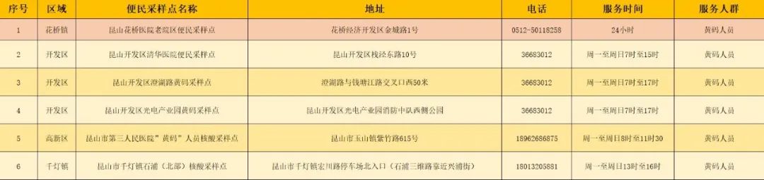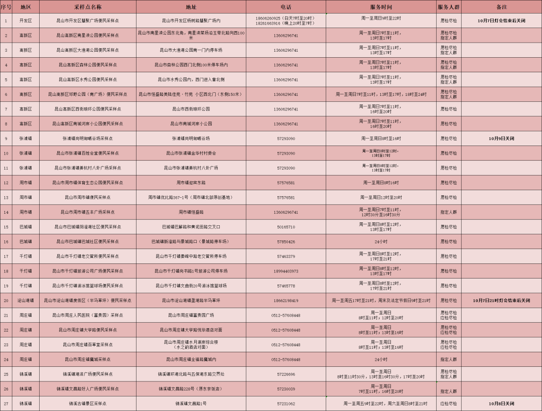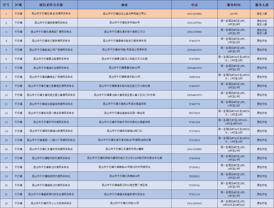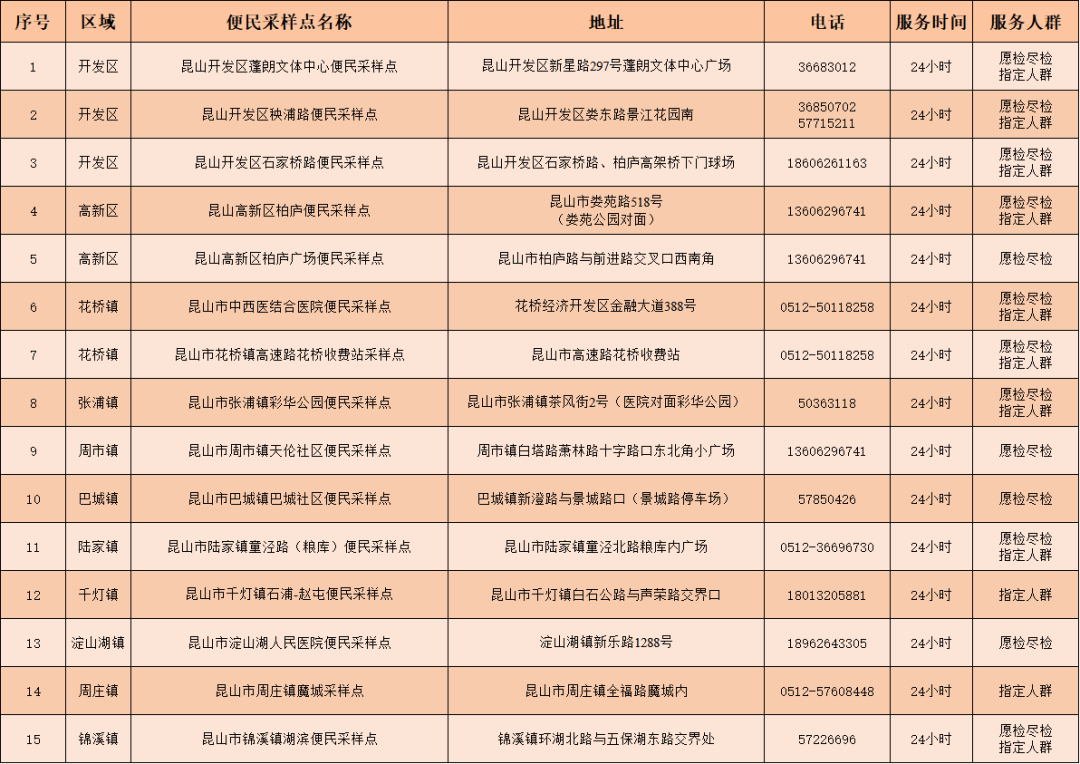 ▲24小时核酸采样点共15个,其中开发区3个,高新区2个,花桥经济开发区2个,张浦镇、周市镇、陆家镇、巴城镇、千灯镇、淀山湖镇、周庄镇及锦溪镇各1个。