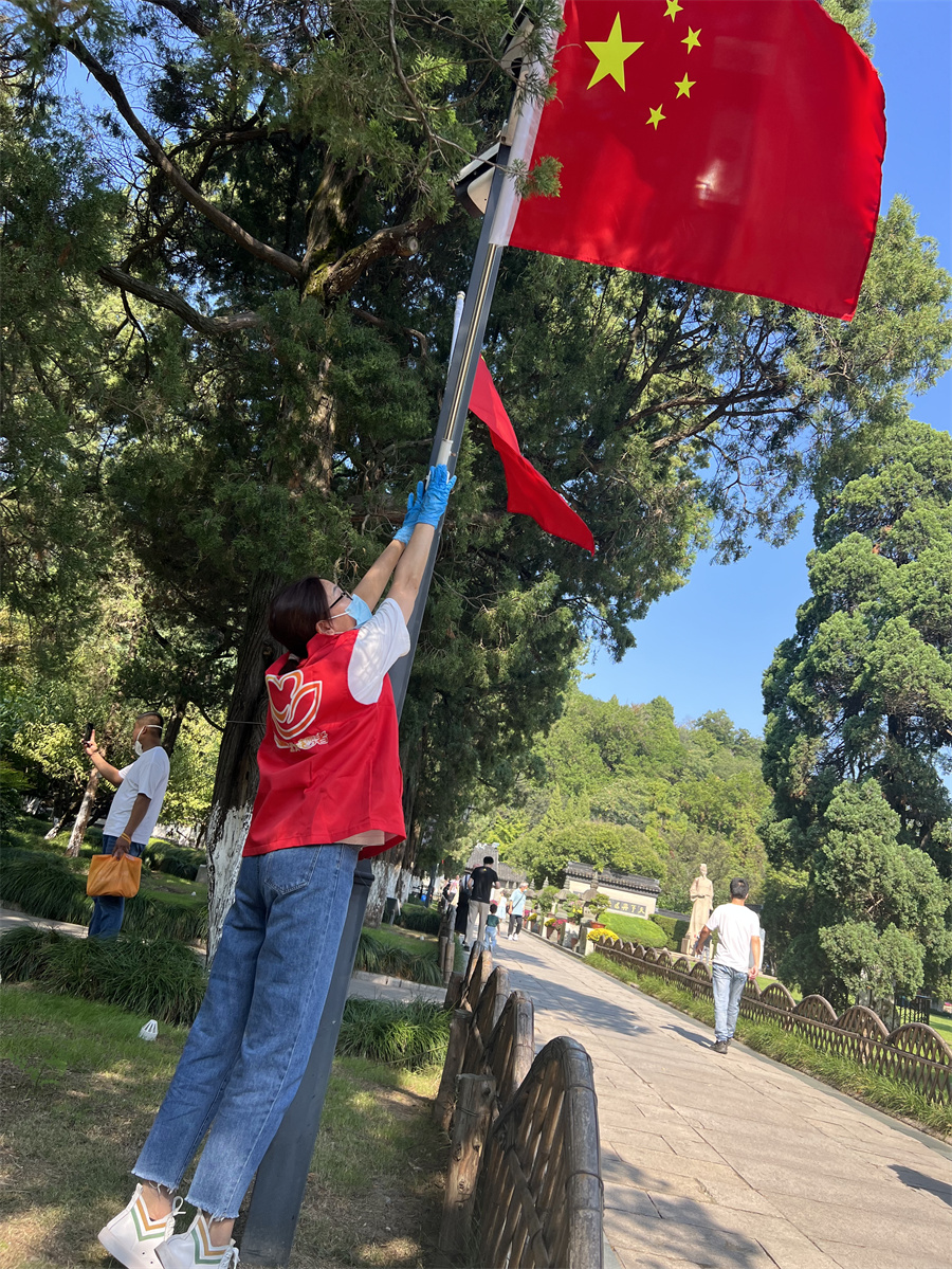 从2017年至今,志愿者闵琼芳一直都在参与志愿活动,今天上午8点,身着志愿者马甲、佩戴口罩的她就守候在公园入口处。不到一个小时,景区门口的游客便多了起来。除了开展体温检测、信息登记、文明引导、定时巡园和防疫宣传外,闵琼芳和她的团队小伙伴们还是护旗志愿者。她们会定时巡查亭林园内的国旗和亭林园外沿街商铺的国旗,看到有卷曲或破损,她们就会立刻上前整理抚平,让五星红旗高高飘扬。