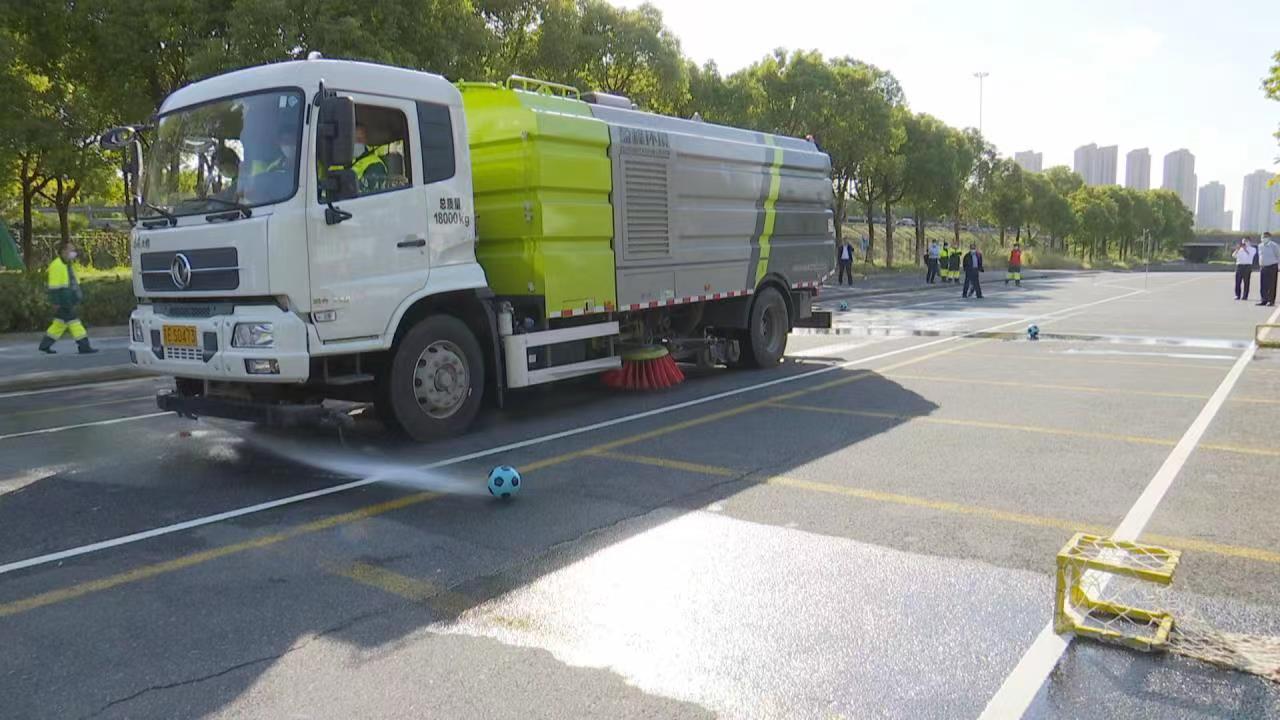 当天下午,在晨风路停车场的实操现场,参赛工人仔细观察路况,操作清扫车,将足球精准射入门内;在操控复合型洗扫一体车画弧线扫街时,参赛工人既要用扫刷让路边摆放的一排瓶盖移位,又要保证后方紧挨着的矿泉水瓶立着不倒,容不得厘米间的误差。“环卫工作机械化,我们环卫工人要掌握相应技能,提高工作效率。”参与本次培训的环卫工人都不由发出这样的感慨。